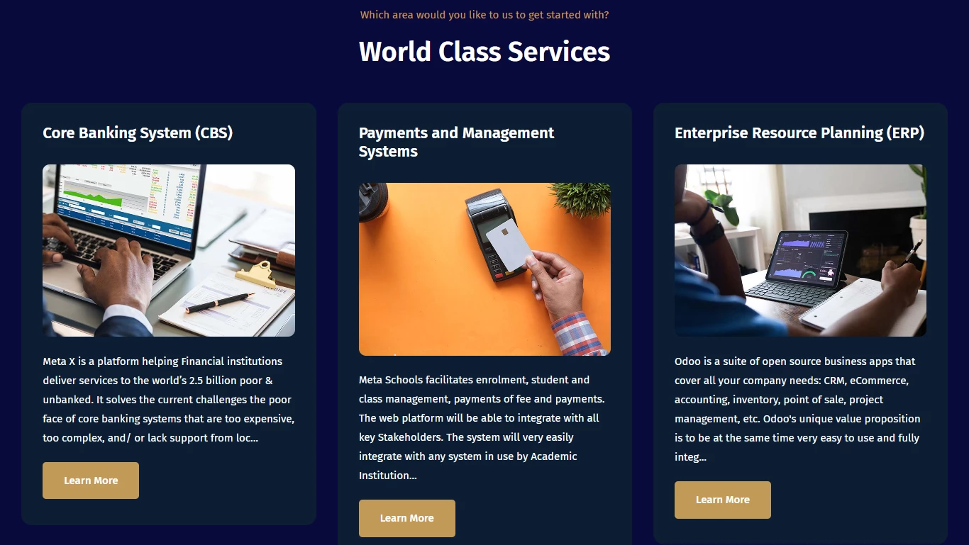 In collaboration with MetaCloud, we embarked on an 8-week project to design a website that effectively communicates their advanced core banking and ERP solutions. The home page serves as an inviting gateway, featuring engaging visuals, intuitive navigation, a succinct services overview, and an easily accessible contact form. The "About" page delves deeper into MetaCloud's story. Meanwhile, the "Services" page categorizes its offerings for easy exploration, providing detailed service descriptions and compelling call-to-action buttons. The service detail pages offer in-depth insights. Lastly, the "Contact Us" page streamlines communication through a user-friendly form, location information, and social media links. The result is a modern, user-friendly website that serves as a valuable asset for MetaCloud, effectively showcasing their expertise and values.